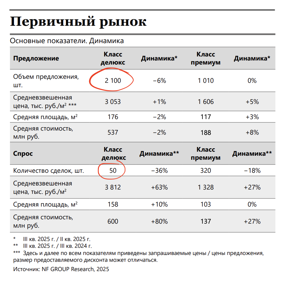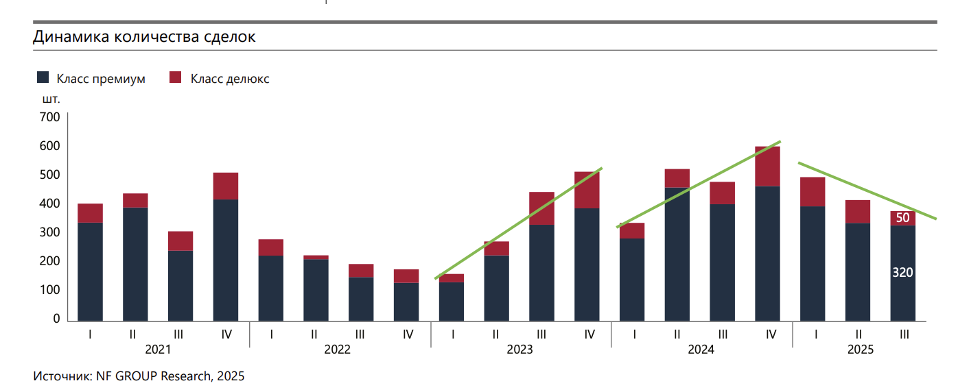 - Если посмотреть внимательно, то в 3К2025 года на первичном рынке было заключено 50 сделок в сегменте "Делюкс", падение год к году на 36%.