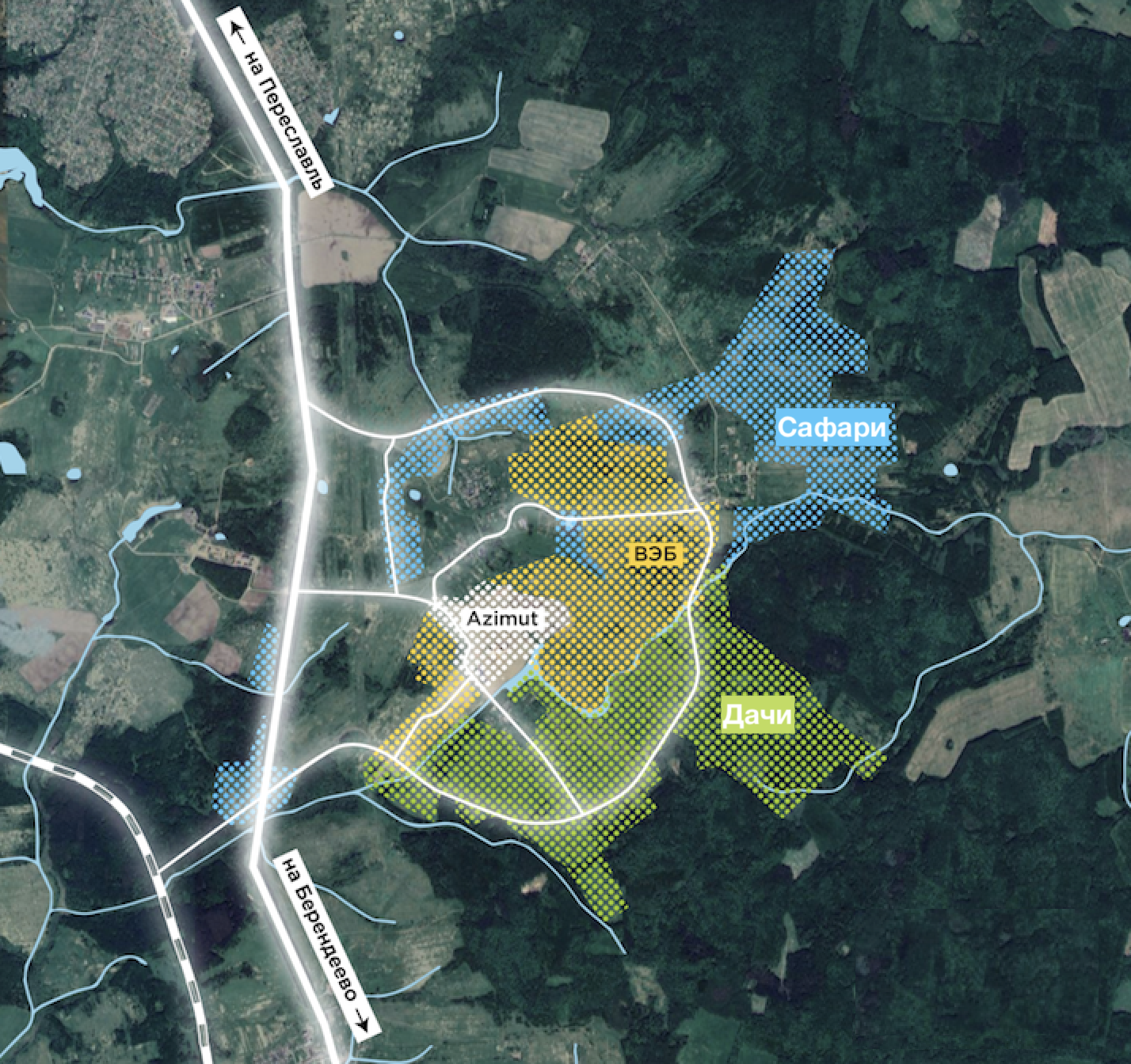 - AZIMUT занимает территорию площадью 30 га. Дополнительно ВЭБ владеет земельным участком площадью около 170 га под рекреацию. В настоящий момент у ВЭБа нет четких планов по развитию этого земельного участка.