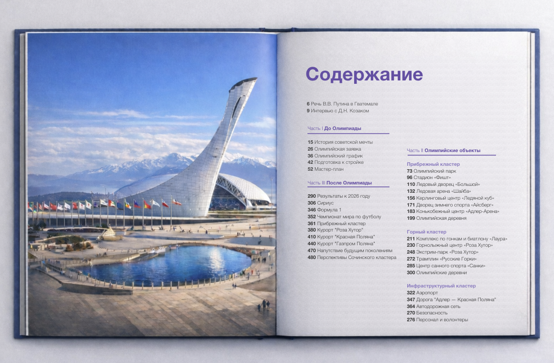 В книге 550 страниц. Половину книги занимают архивные фотографии и эксклюзивные иллюстрации, четверть — интервью с ключевыми участниками проекта, их воспоминания и опыт, и последняя четверть — аналитические и обзорные материалы от профессионалов в области градостроительства, девелопмента, туризма и спорта.