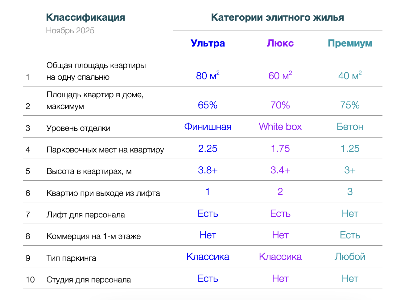 Рынок элитного жилья в Москве подошел к новой стадии развития, когда должен соответствовать мировым стандартам. В этой классификации определены 3 категории и 10 базовых критериев. Здесь отсутствует самый важный критерий "Расположение", который по умолчанию должен соответствовать уровню и цене жилья.